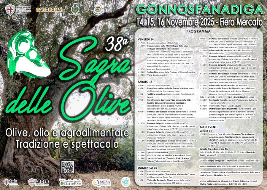 La 38^ sagra delle olive, dell'olio e dell'agroalimentare si svolgerà nelle giornate del 14, 15 e 16 novembre 2025 a Gonnosfanadiga. Il programma dell'evento si presenta anche per quest'anno ricco e variegato e prevede convegni, laboratori e percorsi del ...